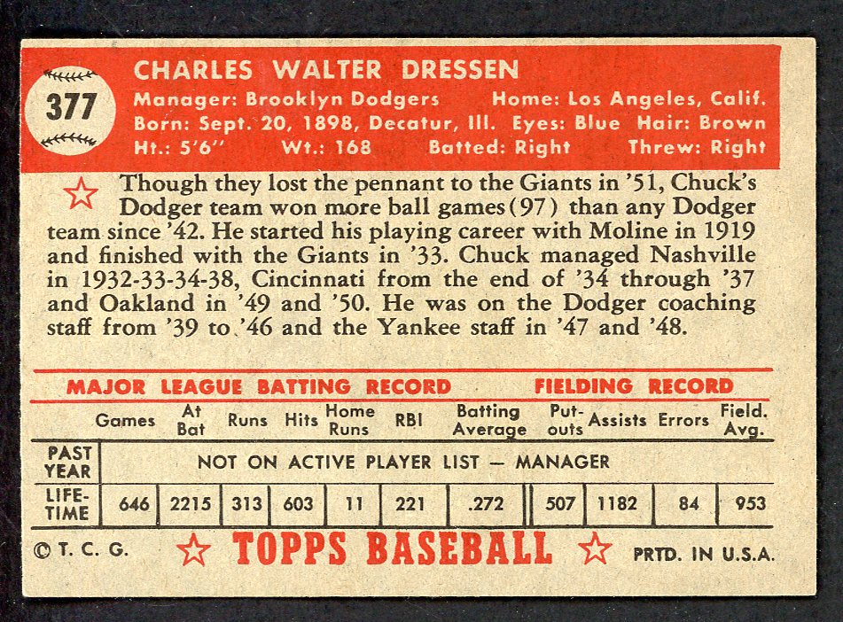 1952 Topps Baseball #377 Chuck Dressen Dodgers EX-MT 546908