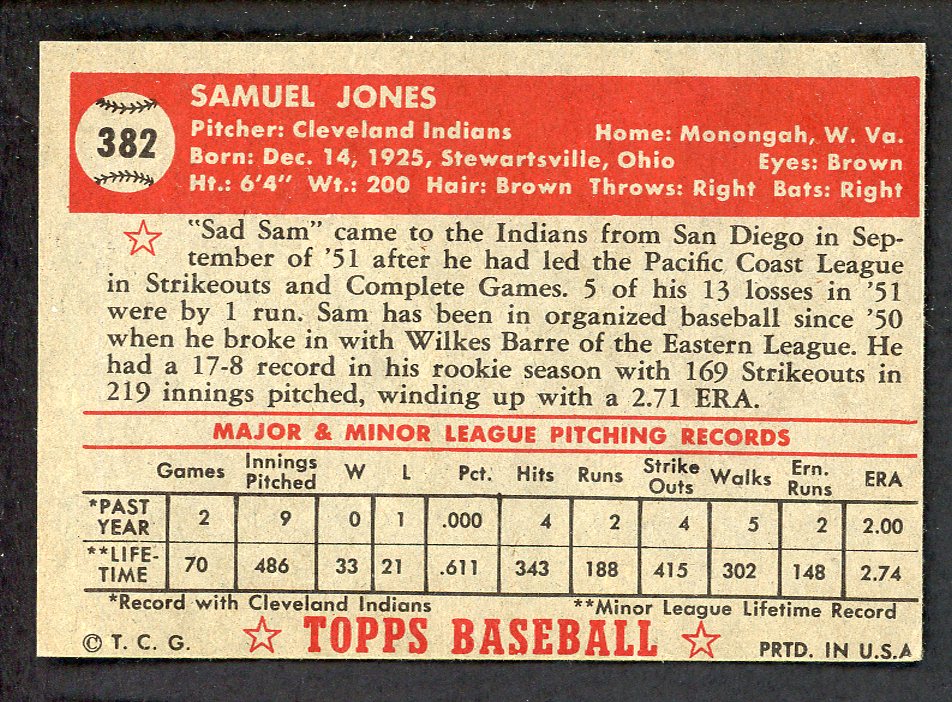1952 Topps Baseball #382 Sam Jones Indians EX-MT 546904