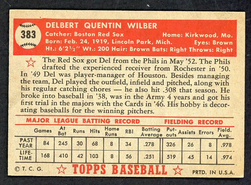 1952 Topps Baseball #383 Del Wilber Red Sox EX-MT 546909