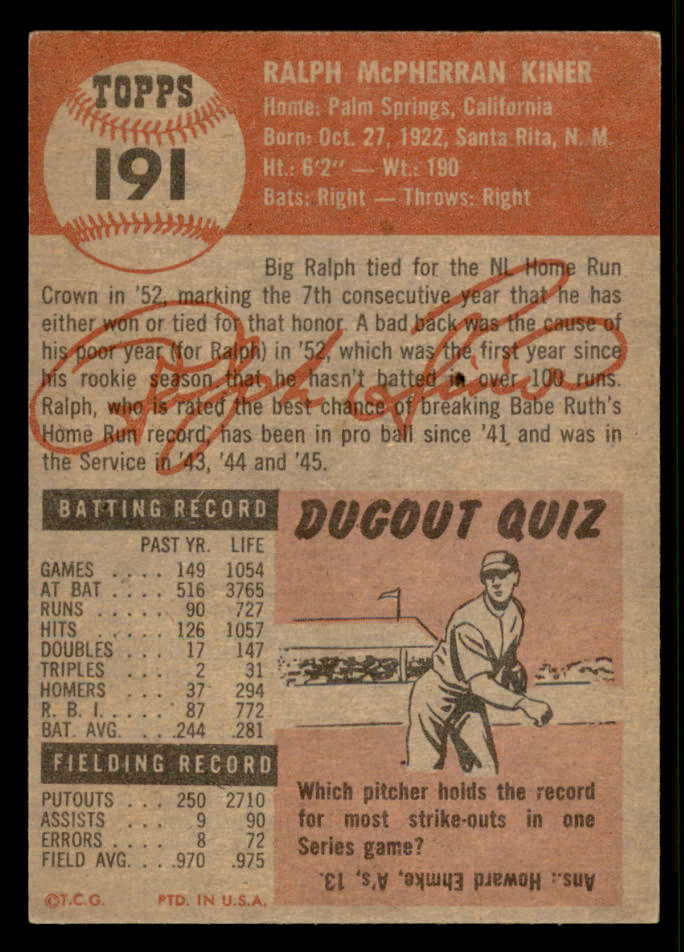 1953 Topps Baseball #191 Ralph Kiner Pirates EX 544684