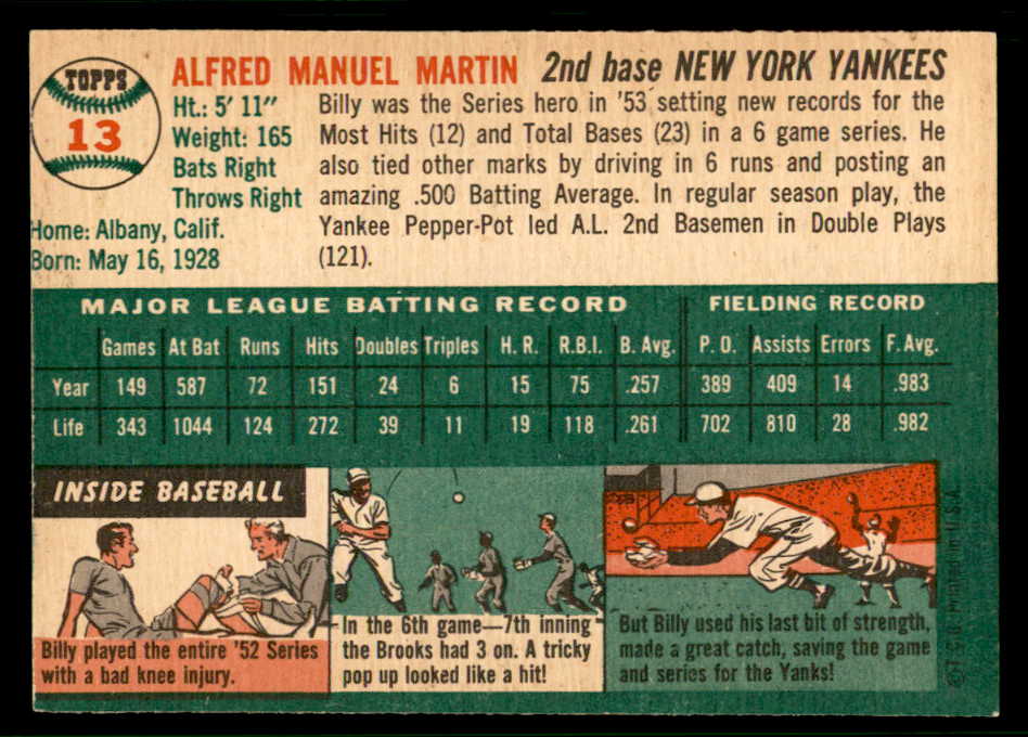 1954 Topps Baseball #013 Billy Martin Yankees EX-MT 541875