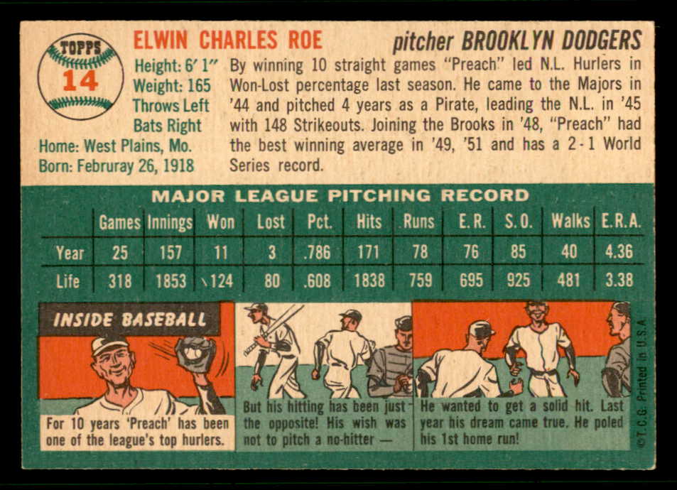 1954 Topps Baseball #014 Preacher Roe Dodgers EX-MT 541965