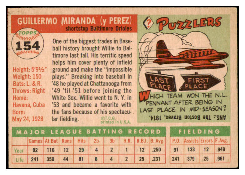 1955 Topps Baseball #154 Willie Miranda Orioles EX-MT 528048