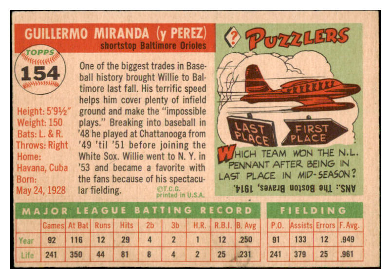 1955 Topps Baseball #154 Willie Miranda Orioles EX-MT 528154