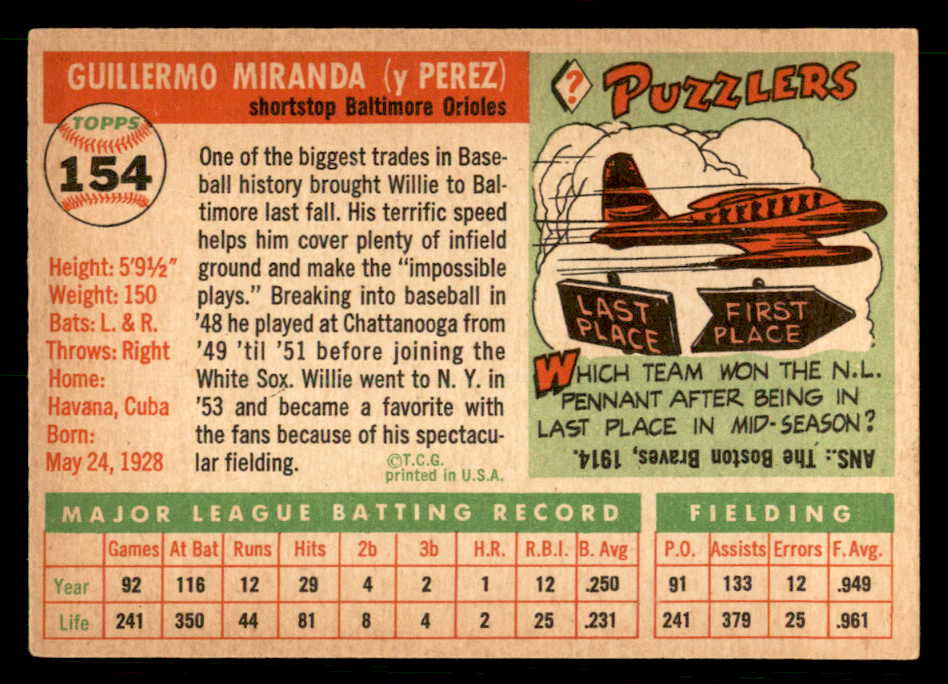 1955 Topps Baseball #154 Willie Miranda Orioles EX-MT 539529