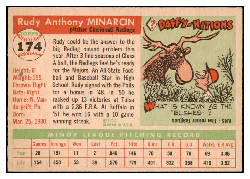 1955 Topps Baseball #174 Rudy Minarcin Reds EX-MT 528020