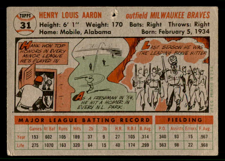 1956 Topps Baseball #031 Hank Aaron Braves FR-GD tack hole Gray 542385