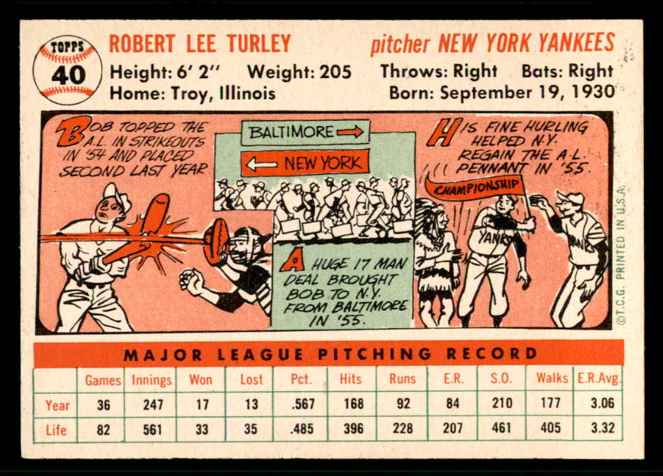 1956 Topps Baseball #040 Bob Turley Yankees NR-MT White 541206