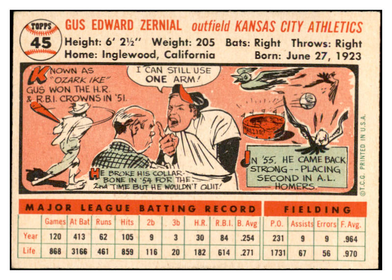1956 Topps Baseball #045 Gus Zernial A's EX-MT White 535090