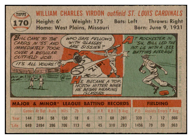 1956 Topps Baseball #170 Bill Virdon Cardinals EX-MT Gray 535194