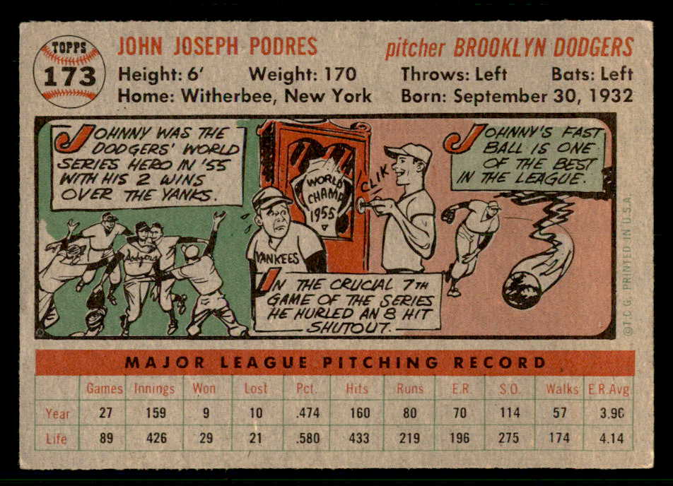 1956 Topps Baseball #173 Johnny Podres Dodgers EX+/EX-MT Gray 541215