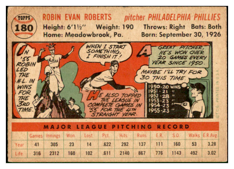 1956 Topps Baseball #180 Robin Roberts Phillies EX White 537494