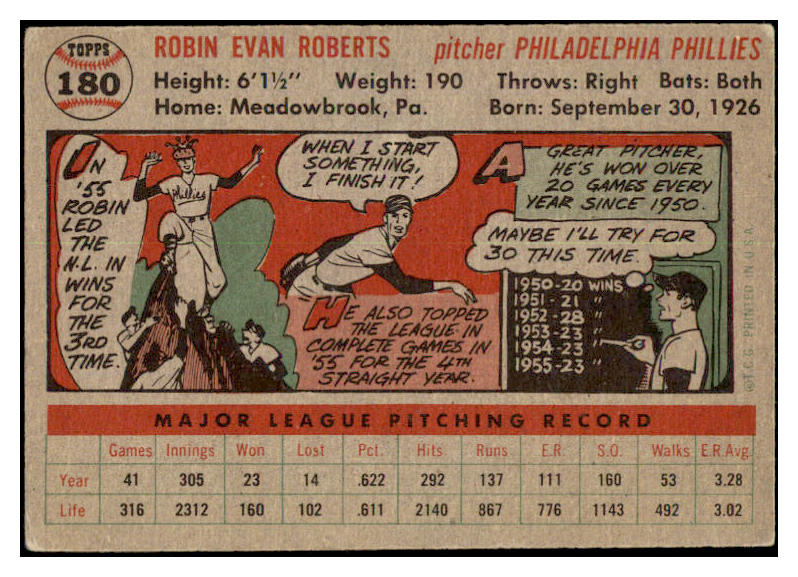 1956 Topps Baseball #180 Robin Roberts Phillies VG-EX Gray 530790