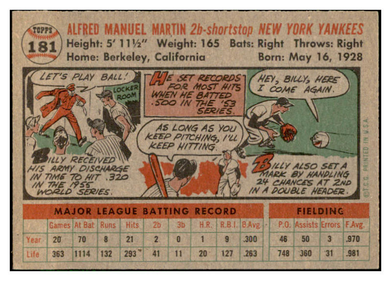 1956 Topps Baseball #181 Billy Martin Yankees EX-MT 535207