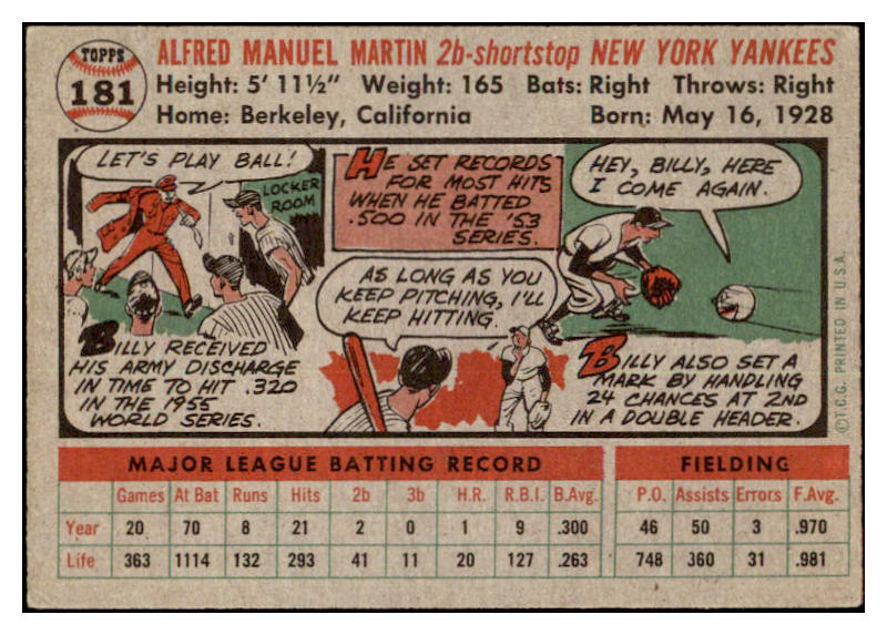 1956 Topps Baseball #181 Billy Martin Yankees VG-EX 530788