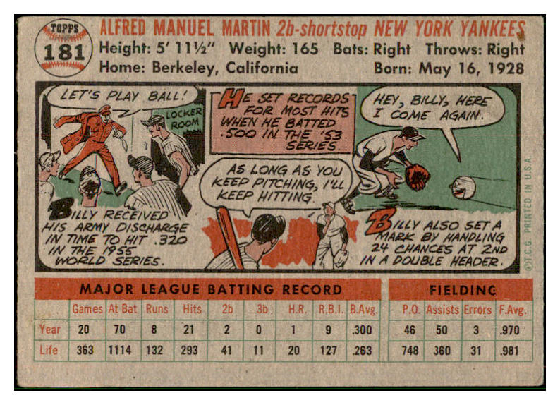 1956 Topps Baseball #181 Billy Martin Yankees VG-EX 537508