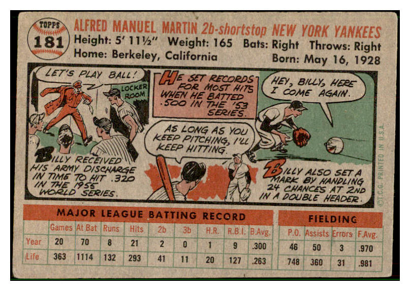 1956 Topps Baseball #181 Billy Martin Yankees VG-EX 537514