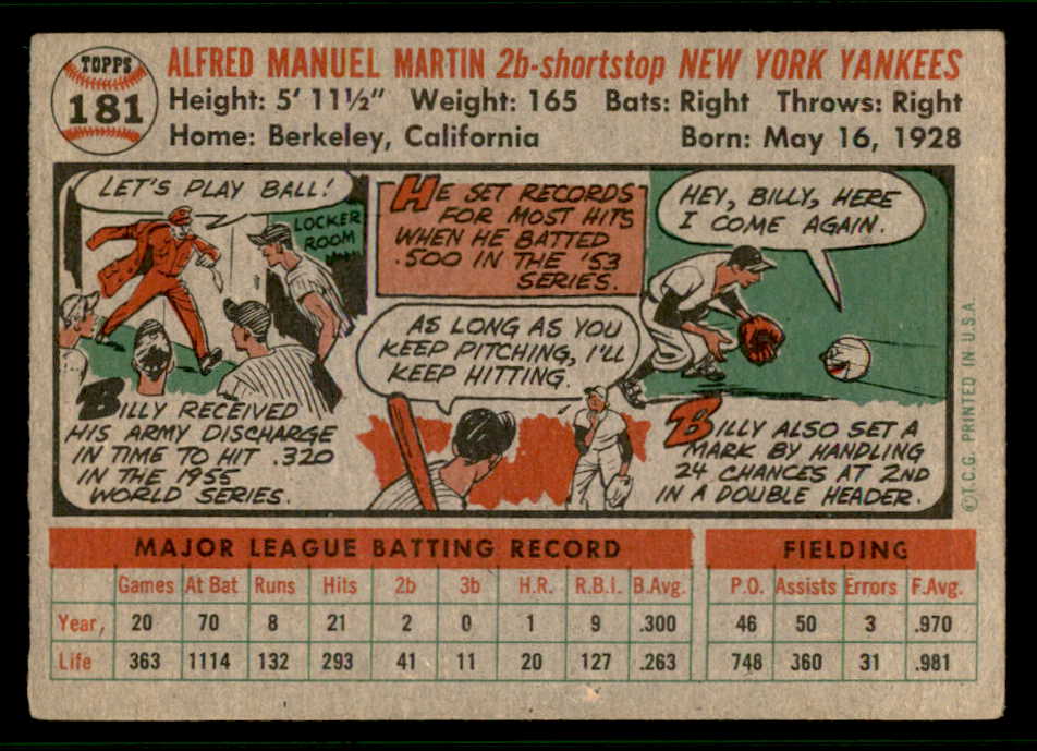1956 Topps Baseball #181 Billy Martin Yankees VG-EX 541808