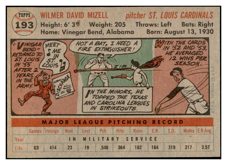 1956 Topps Baseball #193 Wilmer Mizell Cardinals EX-MT 535218