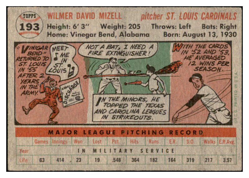 1956 Topps Baseball #193 Wilmer Mizell Cardinals EX-MT 535219