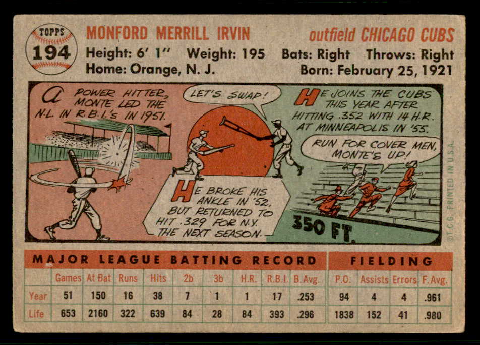 1956 Topps Baseball #194 Monte Irvin Cubs EX 541200