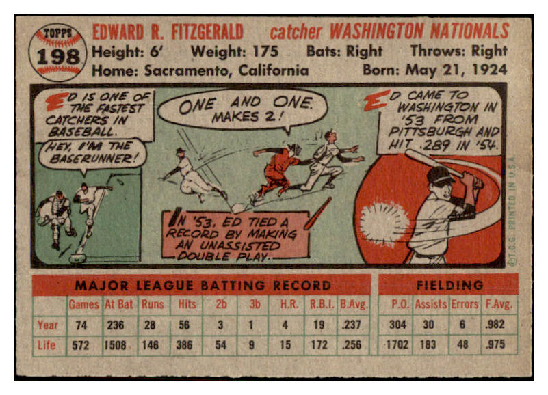 1956 Topps Baseball #198 Ed Fitzgerald Senators EX-MT 528169