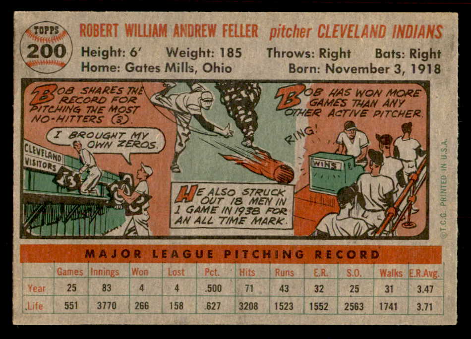 1956 Topps Baseball #200 Bob Feller Indians EX-MT 539106