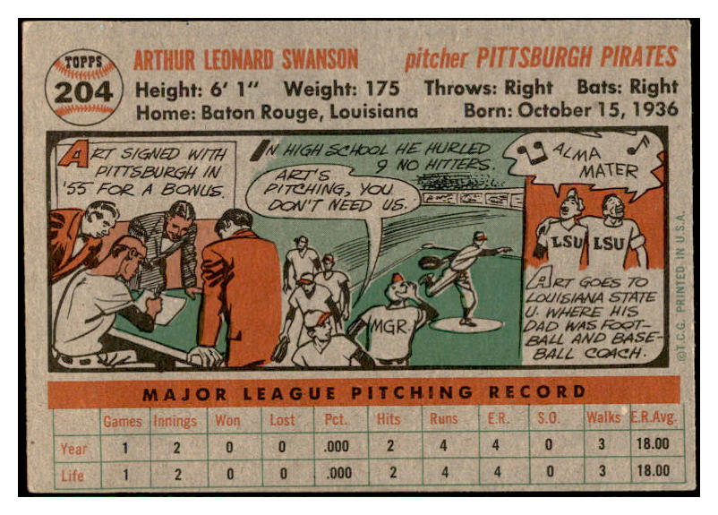 1956 Topps Baseball #204 Art Swanson Pirates EX-MT 535231