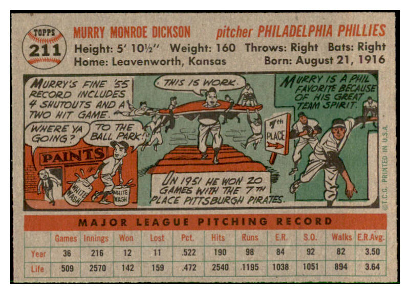 1956 Topps Baseball #211 Murry Dickson Phillies EX-MT 535241