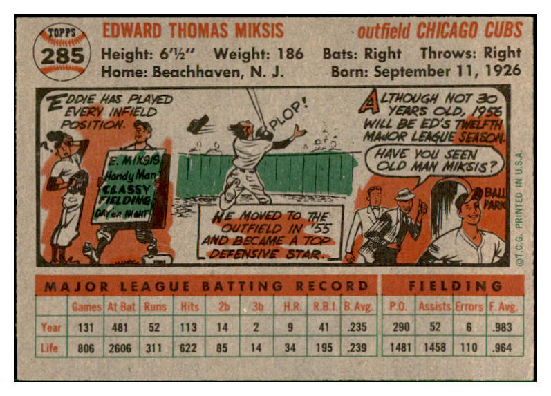 1956 Topps Baseball #285 Eddie Miksis Cubs EX-MT 535320