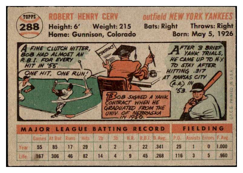 1956 Topps Baseball #288 Bob Cerv Yankees EX-MT 528371