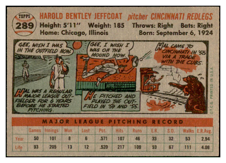 1956 Topps Baseball #289 Hal Jeffcoat Reds EX-MT 535324