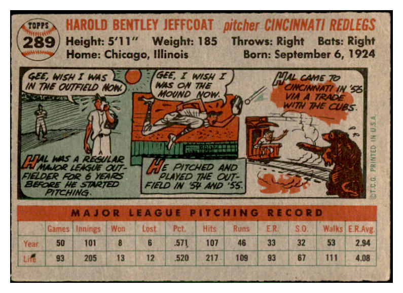 1956 Topps Baseball #289 Hal Jeffcoat Reds EX-MT 535325