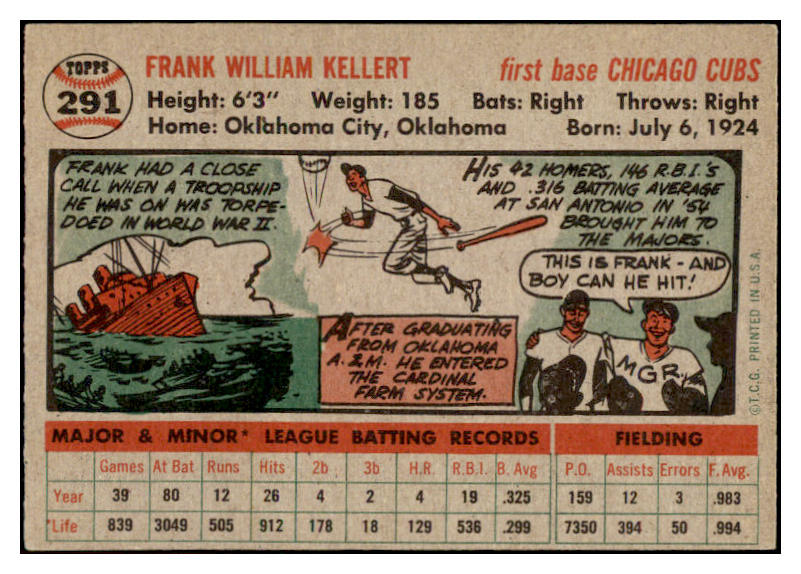 1956 Topps Baseball #291 Frank Kellert Cubs EX-MT 528232