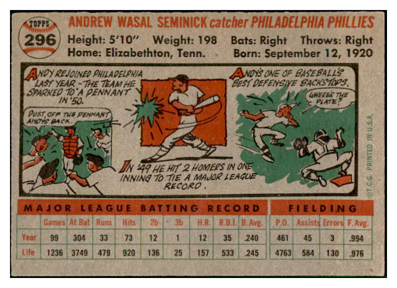 1956 Topps Baseball #296 Andy Seminick Phillies EX-MT 535334