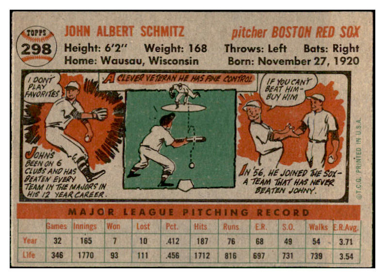 1956 Topps Baseball #298 Johnny Schmitz Red Sox EX-MT 535338