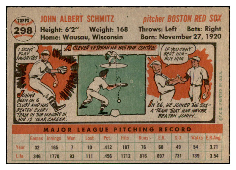 1956 Topps Baseball #298 Johnny Schmitz Red Sox EX-MT 535339