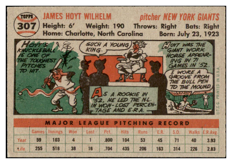 1956 Topps Baseball #307 Hoyt Wilhelm Giants EX-MT 529708