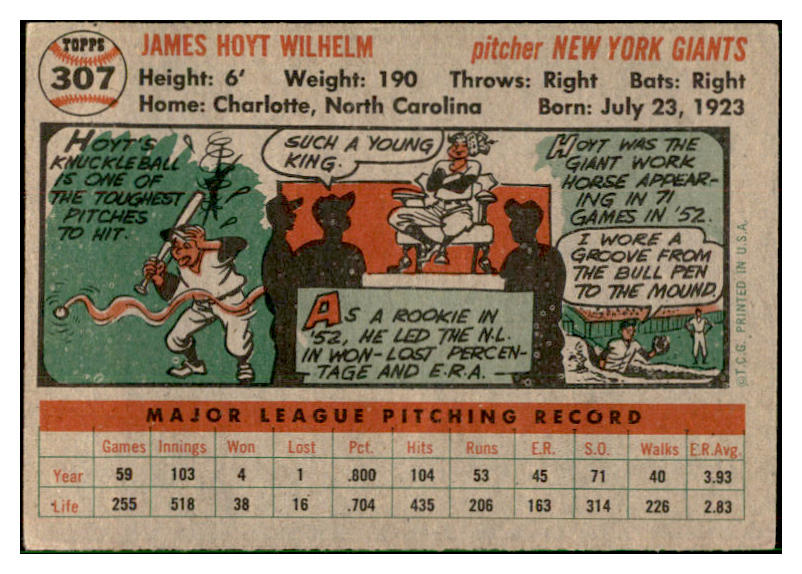 1956 Topps Baseball #307 Hoyt Wilhelm Giants VG-EX 537509