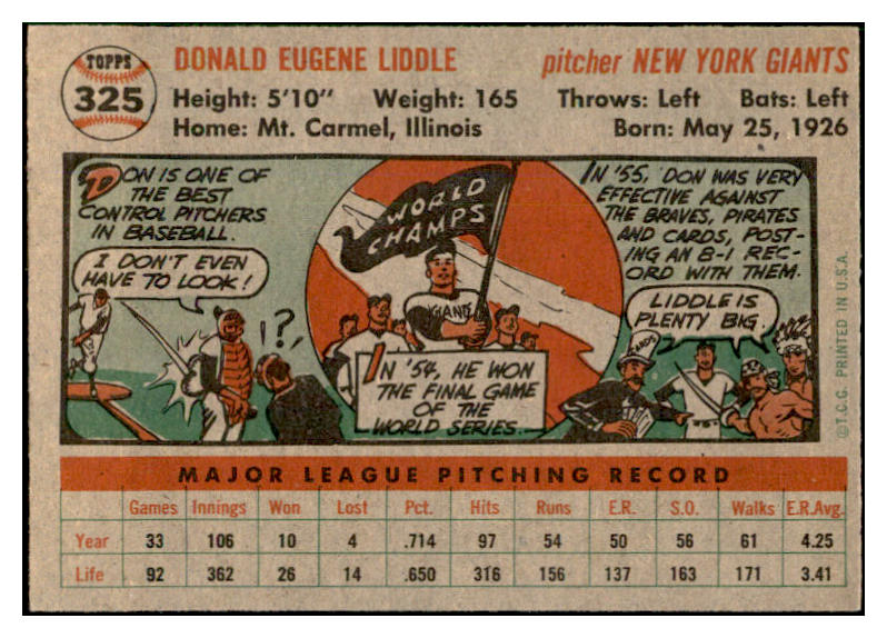 1956 Topps Baseball #325 Don Liddle Giants EX-MT 535370