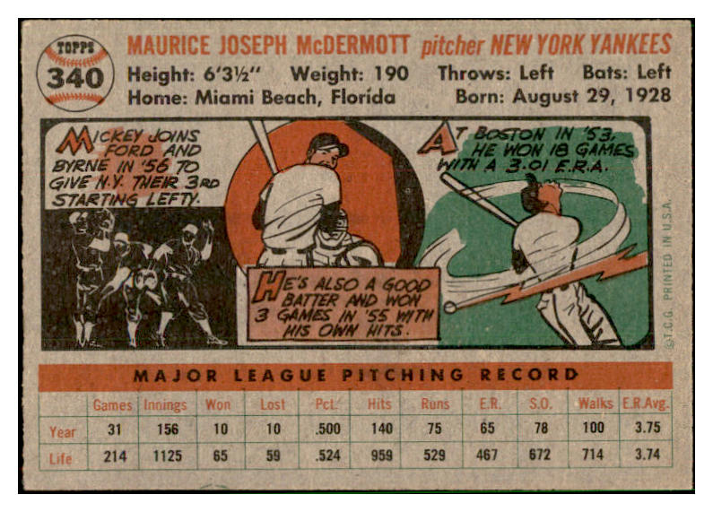 1956 Topps Baseball #340 Mickey McDermott Yankees EX-MT/NR-MT 537495