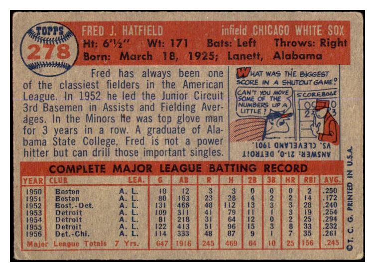 1957 Topps Baseball #278 Fred Hatfield White Sox VG 527612