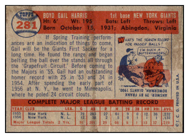 1957 Topps Baseball #281 Gail Harris Giants GD-VG 530599