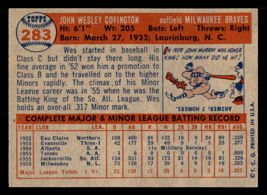 1957 Topps Baseball #283 Wes Covington Braves EX-MT 539490