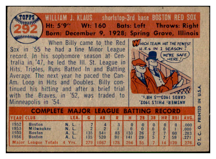 1957 Topps Baseball #292 Billy Klaus Red Sox VG-EX 532589