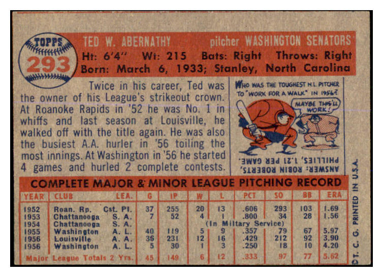 1957 Topps Baseball #293 Ted Abernathy Senators VG 527607