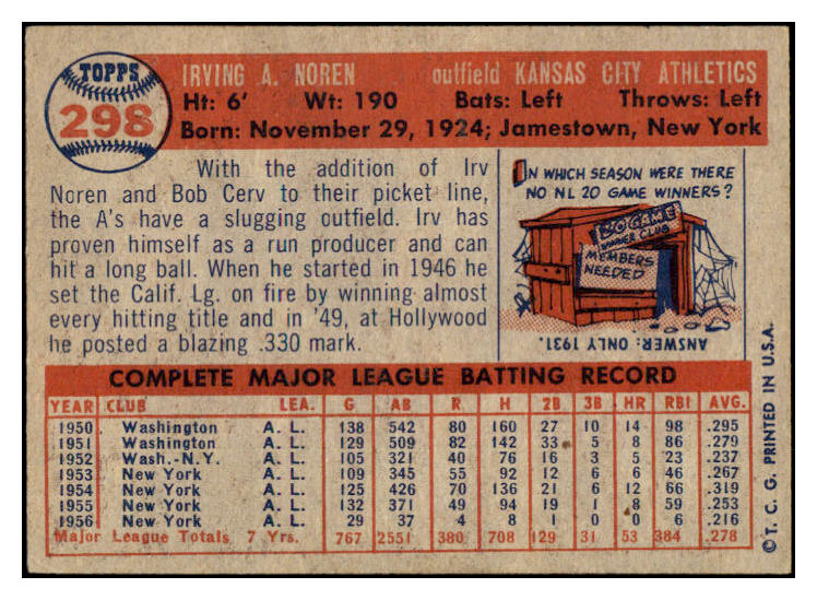 1957 Topps Baseball #298 Irv Noren A's EX-MT 523872