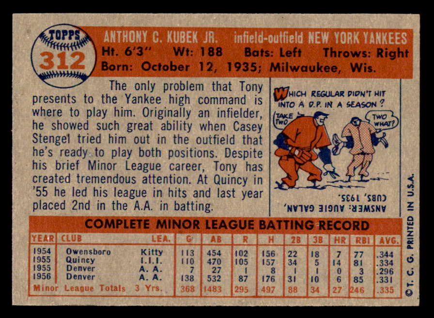 1957 Topps Baseball #312 Tony Kubek Yankees EX 540041