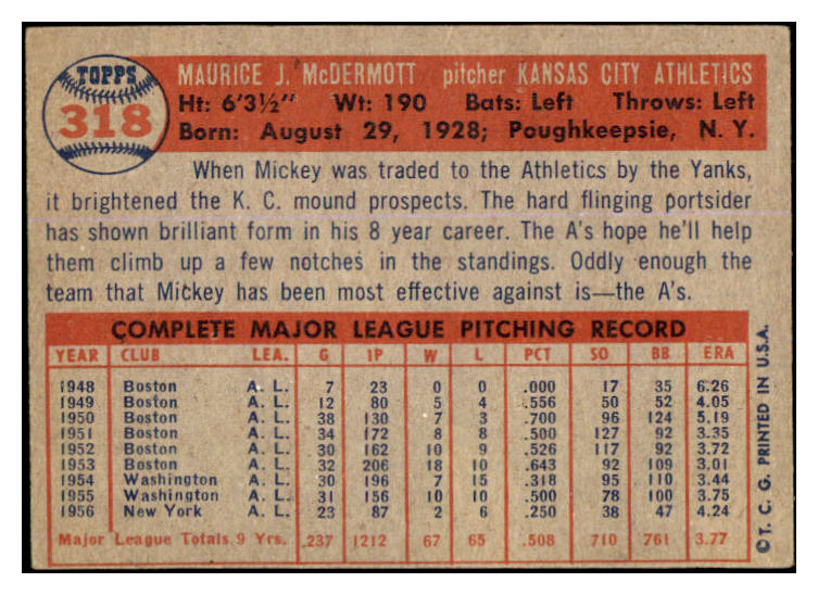 1957 Topps Baseball #318 Mickey McDermott A's EX 527647