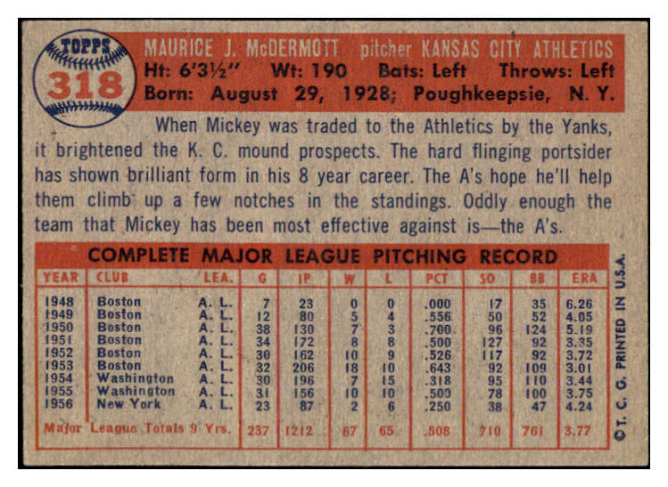 1957 Topps Baseball #318 Mickey McDermott A's VG-EX 530602